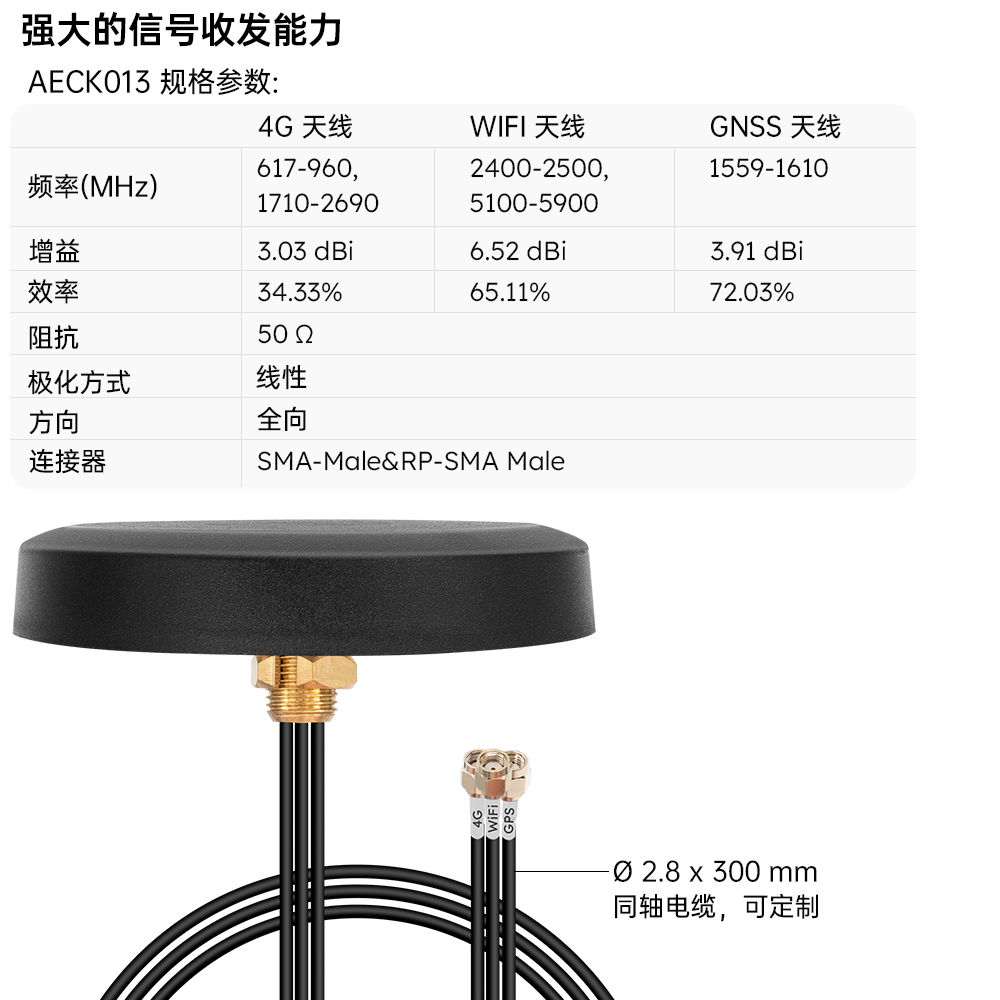 | AECK013 | 4G+WIFI+GPS三合一圆形机柜天线 81.1mm × 14.5mm | M02-0501920R0A | 支持定制 |