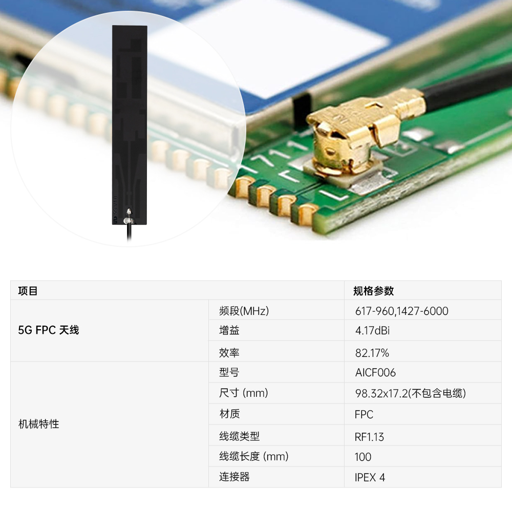 | AICF006 | 5G天线 超宽频贴片天线 FPC天线 IPEX4 接口 | M01-0100100R0A | 支持定制 |