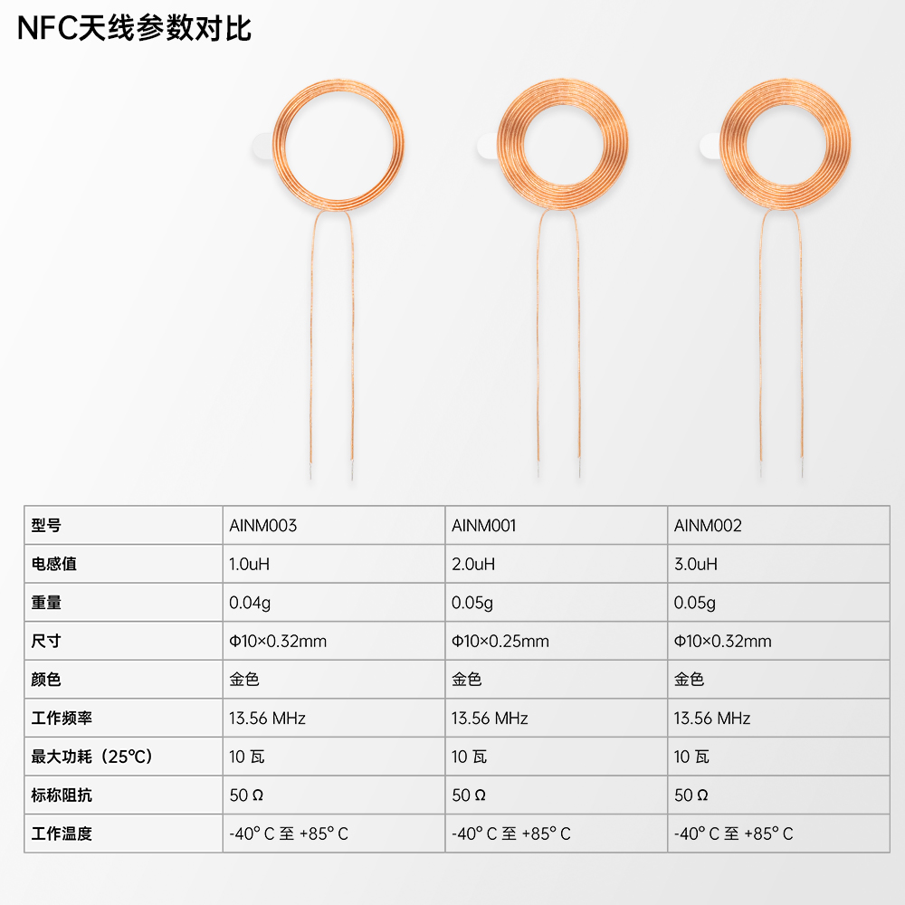 | AINM002 | Φ10 x 0.25mm NFC 2.0uH 绕线式天线 13.56MHZ | M04-0106310R0A | 支持定制 |